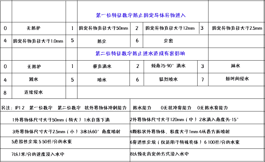 IEC144規(guī)定的殼體保護(hù)等級由一個(gè)對應(yīng)其抗外界物體沖擊與穿刺能力及防水能力的代碼表示。例如:本安型儀表測量電路板不應(yīng)從其殼體中取出,否則會違反IP40所提出的最低要求。保護(hù)等級由兩位數(shù)字組成,在其前加上IP字樣。