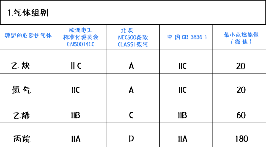 中國GB3836標(biāo)準(zhǔn)規(guī)定ⅡC級最小點(diǎn)燃能量為19微焦耳,ⅡA級最小點(diǎn)燃能量為200微焦耳。