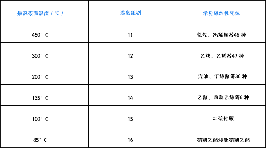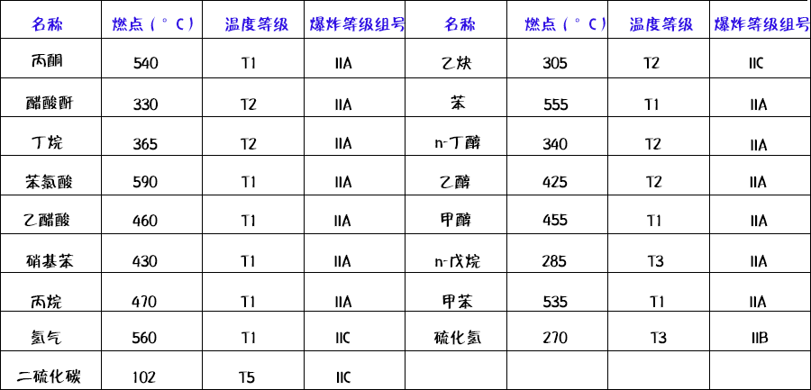 這是與氣體點(diǎn)燃溫度有關(guān)的電氣設(shè)備(假定環(huán)境溫度為40℃時(shí))的最高表面溫度,點(diǎn)燃能量與點(diǎn)燃溫度無關(guān)。在標(biāo)準(zhǔn)BS5345第一部分中列出了所有可燃性氣體和其組別。