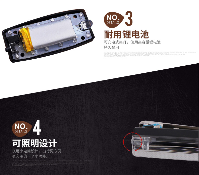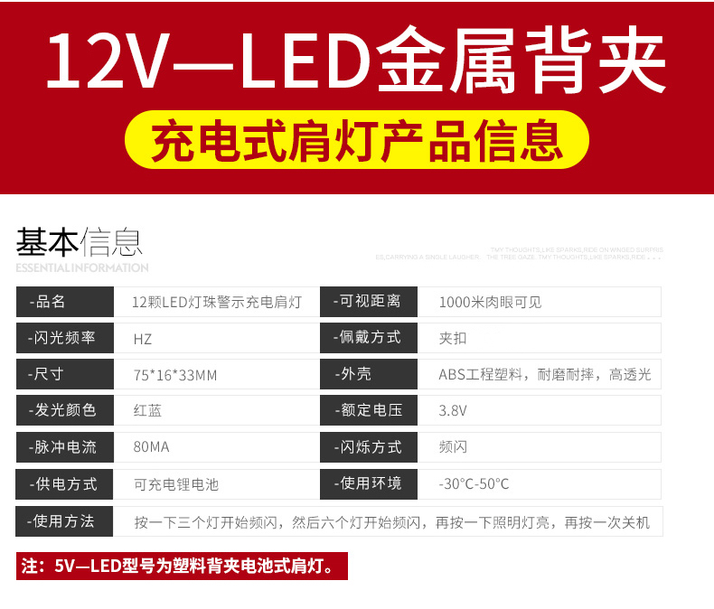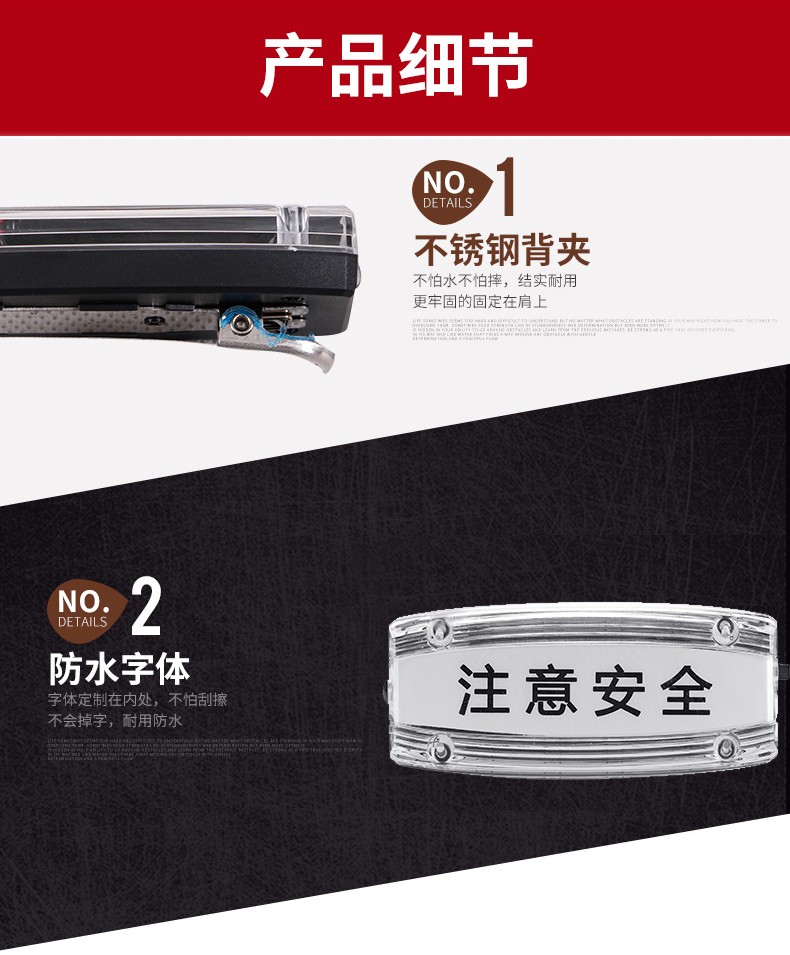 執(zhí)勤肩燈主要用于公路交通工作人員,道路環(huán)衛(wèi)工人以及行人夜間道路安全警示,通過(guò)多模式,高警示,自主LED發(fā)光提醒過(guò)往司機(jī)亮燈處有人員存在,小心駕駛,從而達(dá)到保護(hù)佩戴者的功能。曾經(jīng)有新聞報(bào)道,小小的肩燈給一個(gè)在火災(zāi)中的生命帶來(lái)生存的希望,如果沒(méi)有這個(gè)肩燈,那消防救助員就不容易發(fā)現(xiàn)他。相信小小的肩燈會(huì)實(shí)現(xiàn)越來(lái)越多,越來(lái)越大的功能,可以說(shuō)肩燈在某些環(huán)境是保命的法寶。公司所生產(chǎn)的充電肩燈和電池肩燈都是通過(guò)LED自主多模式發(fā)光,實(shí)現(xiàn)爆閃,流水閃,頻閃等高警示閃光,起到非常好的警示效果。