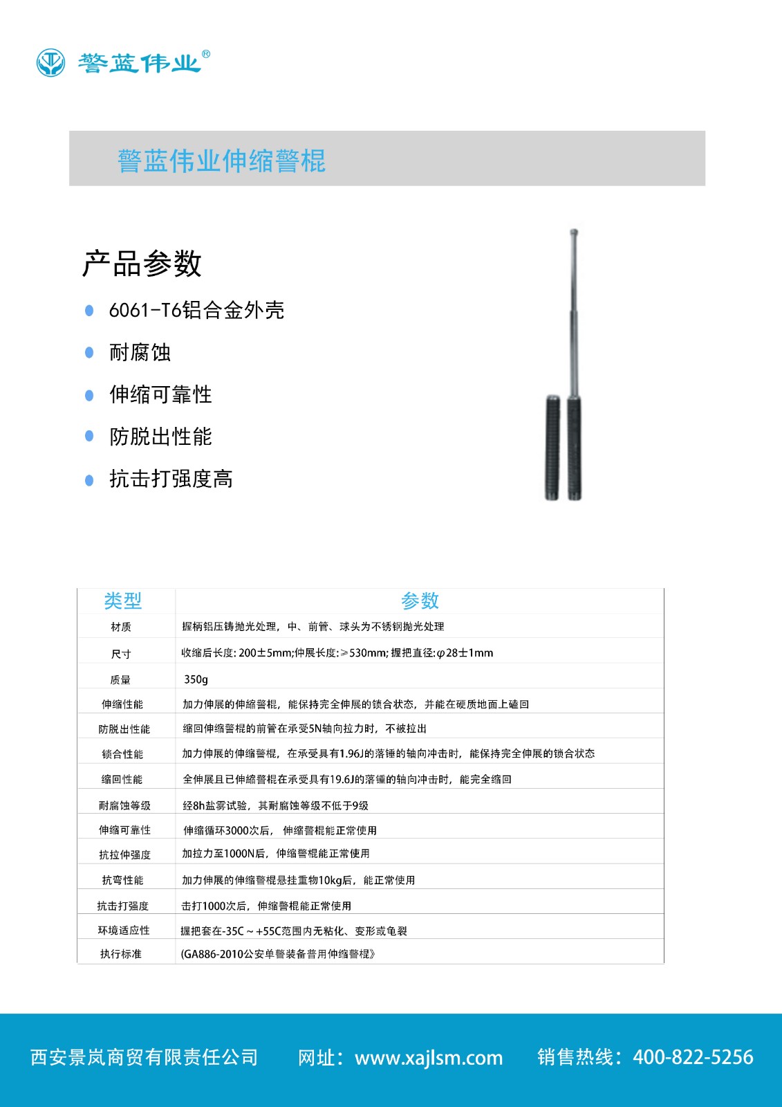 4.伸縮性能:加力伸展的伸縮警棍,能保持完全伸展的鎖合狀態(tài),并能在硬質(zhì)地面上磕回