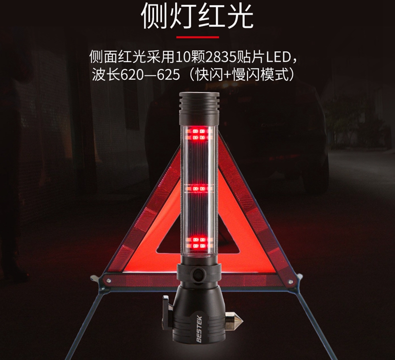 3.側(cè)面紅光采用10顆2835貼片LED,波長620-625(有快閃和慢閃兩個模式);