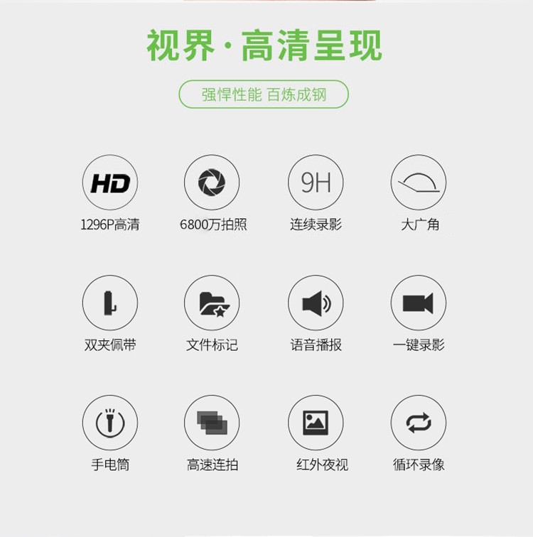 v 專業(yè)攝像,視音頻同時(shí)攝錄,并有一鍵開機(jī)攝像功能,最高分辨率可達(dá)1296P,多種分辨率可選;